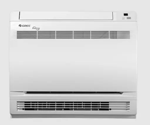 The Gree Console Mini Split Air Handler model CON09HP230V1R32AH provides efficient cooling and heating with a capacity of 9,000 BTU. This unit features a compact design that can be mounted on the floor or wall, making it versatile for various installations. High-quality motor for durability and performance.