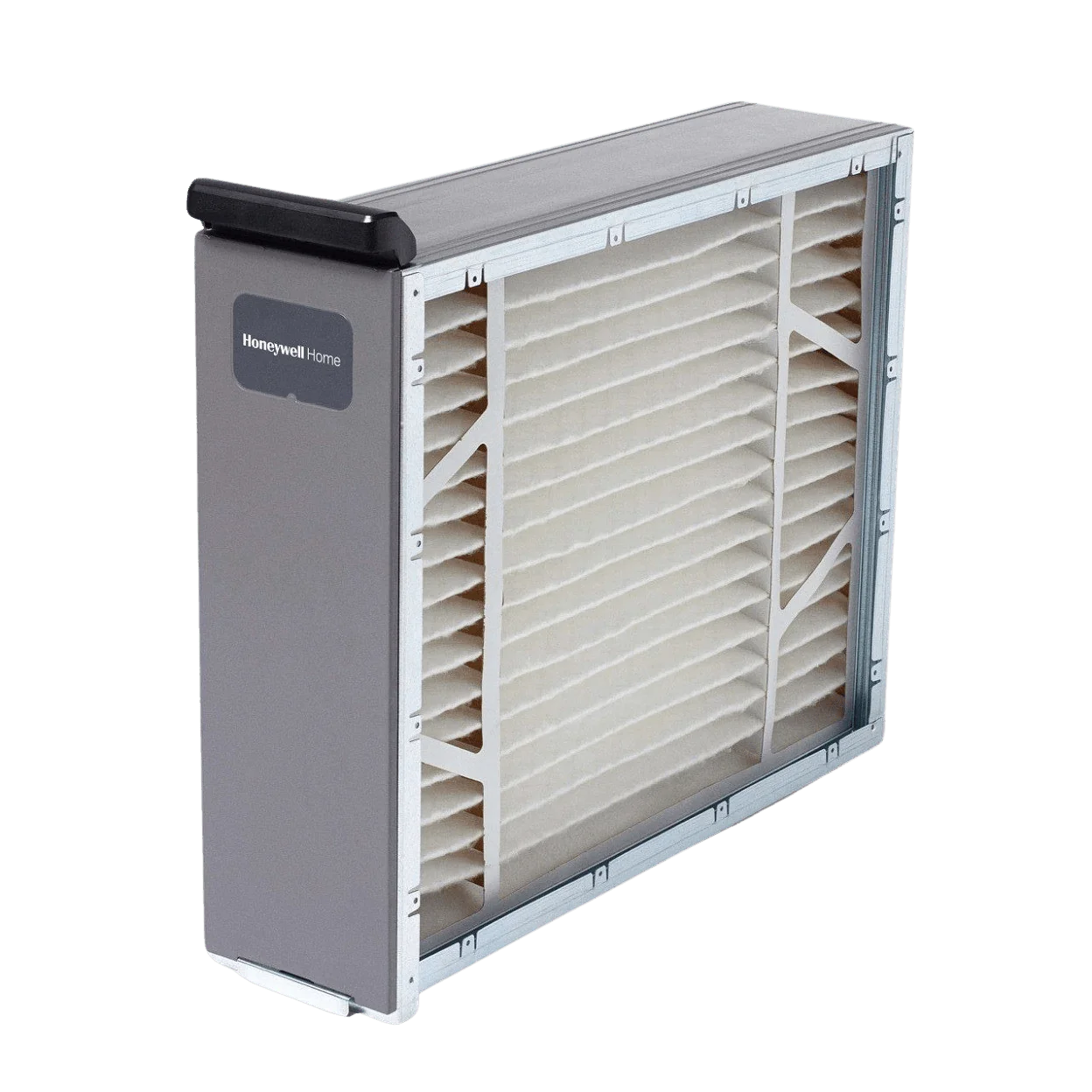The Honeywell F100F1620/U is a media air cleaner designed for effective air filtration in residential settings. It operates at an airflow rate of twelve hundred cubic feet per minute (cfm) and fits standard duct sizes of sixteen inches high by twenty inches wide.