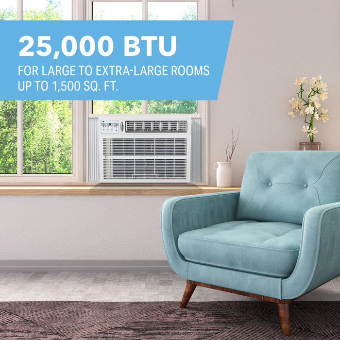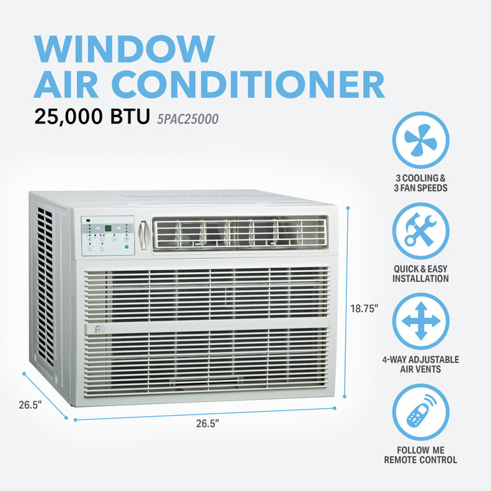 The Perfect Aire PAC25000 is a window air conditioner with a cooling capacity of 25,000 BTU, suitable for rooms up to 1,500 square feet. It includes electronic controls and a full-function remote for easy adjustments from a distance. The air conditioner features a 24-hour timer and multiple modes, including auto, sleep, dry, and energy saver modes.